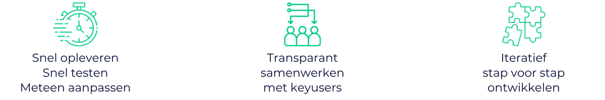 We bouwen snel, testen vroeg en passen direct aan op basis van feedback van de mensen die er dagelijks mee werken. Geen zwarte doos, maar een transparant proces waarbij jouw team ziet wat er gebouwd wordt en meteen kan bijsturen.